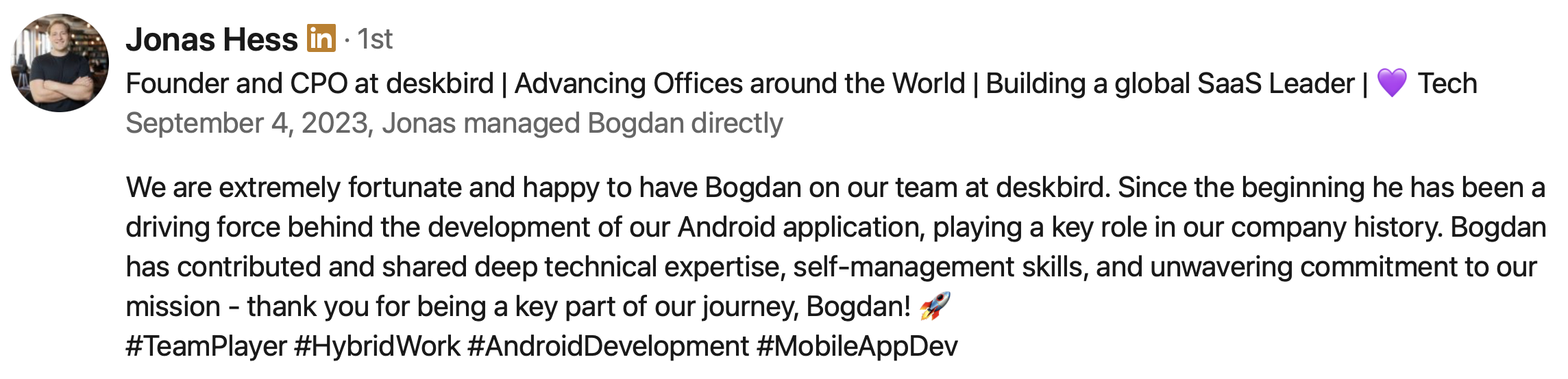 With over 8 years of experience in Android app development, I have a proven track record of delivering high-quality applications tailored to diverse client needs. For the past 5 years, I’ve worked remotely with companies across Europe, developing apps from scratch and managing projects independently. My ability to self-manage and find innovative solutions to complex problems sets me apart.